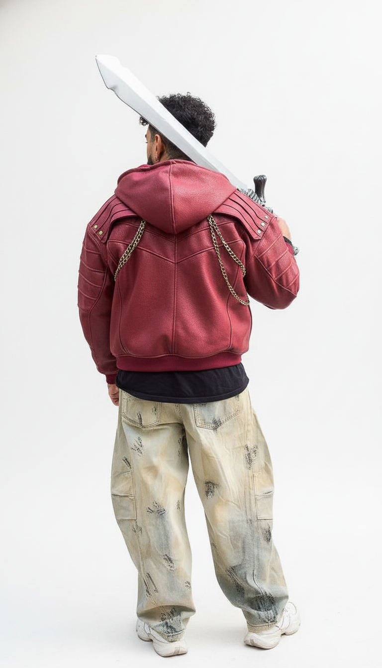 Chaque détail rend hommage à l’esprit rebelle et élégant de Dante : cuir rouge profond, coutures apparentes, doublure technique sombre et coupe boxy oversize, fidèle au style Kaizo-Ku.
